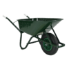 Universele bouwkruiwagen. rondneus model. bak van plaatstaal, naadloos geperst met een ronde neus en dubbel omgelegde rand. onderstel uit ronde stalen buis, uit 1 stuk gebogen inclusief kiepbeugel, kopsteun en bakschoren. aangelaste dwarsversteviging tussen de poten en anti-slijtsloffen aan de poten. onderstel en bak zijn d.m.v. verstevigingssteunen tot 1 geheel samengelast en daarna in milieuvriendelijke groen-blauwe lak op waterbasis gedompeld. geprofileerde kunststof veiligheidshandvatten.