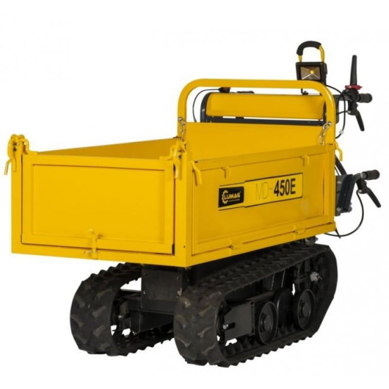Deze Lumag MD450E rups dumper met laad-kiepbak is uniek doordat deze is voorzien van een elektromotor met een 60 volt accu. De motor levert een capaciteit van 800watt. De elektro motor in combinatie met de rupsaandrijving maakt dit tot een zeer universele dumper. De machine is zeer geschikt voor het transport van vele materialen ook in ruwterrein tot een gewicht van 450kg over diverse ondergronden.