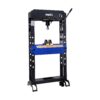 Pers / garagepers / lagerpersDeze Mammuth werkplaatspers is van hoogwaardige kwaliteit en zeer stabiel dankzij het volledig afgelaste zware frame. Het werkbed is met behulp van de handlier makkelijk handmatig in hoogte verstelbaar. De pers is te bedienen met de hendel en pomp (heeft twee snelheden) en met een voetpedaal op perslucht. De hydraulische cilinder is in de breedte (gelagerd) verplaatsbaar en is voorzien van een in hoogte verstelbare, 7,5cm lange spindel. Via de geïntegreerde manometer wordt de persdruk afgelezen.Wordt geleverd inclusief 2 zware persblokken, 8 perspennen en een onderdelen bak.Technische specificaties  capaciteit = 30 ton  cilinder slag = 220mm  bedbreedte = 750mm  beddiepte = 187mm  werkbereik = 830mm  werkdruk = 8 – 12 bar  luchtaansluiting = 1/4″ NPT uitwendige schroefdraad
